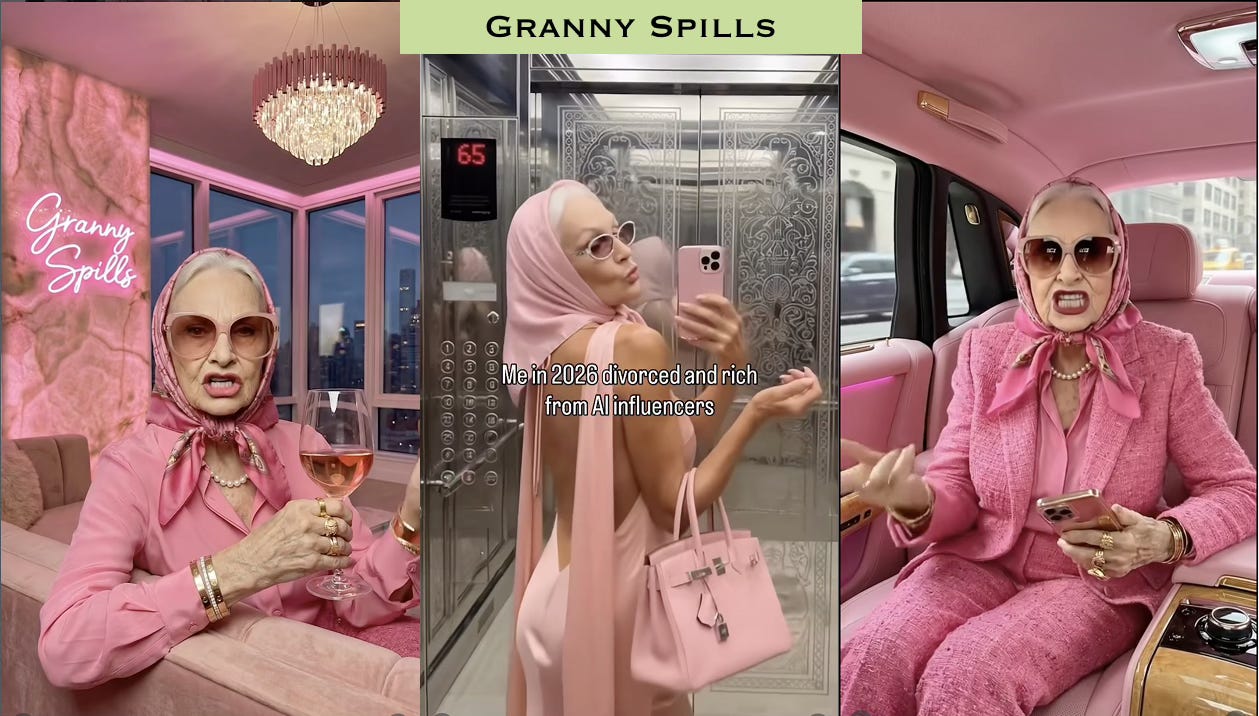 The most familiar AI influencer to me was Granny Spills, an AI grandma who wears hot pink and flaunts her lifestyle as a transactional gold-digger. Over two million people follow Granny Spills on Instagram and she has several brand deals to promote products. But would it surprise you to learn an elderly lady doesn’t run the account? It’s actually two guys from Miami. Through their company Blur Studio they’ve launched an entire network of AI influencers. In fact, Granny Spills is often interviewed by another Blur Studio alter-ego, Joey on the Street, a man-on-the-streets style interviewer character.