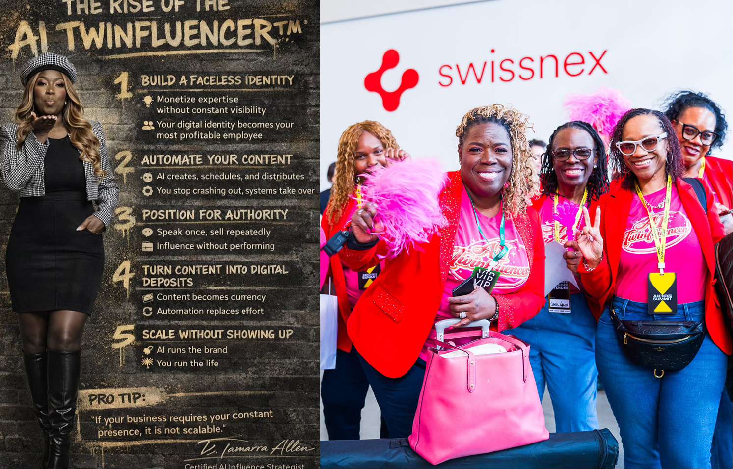The event was also full of aspiring AI influencers, people striving to find large followings for their AI personas. I met one group of ladies in matching pink shirts who had flown in together from Atlanta. They were part of a group called the “AI Twinfluencers” and were all launching AI influencer alter egos of themselves.
